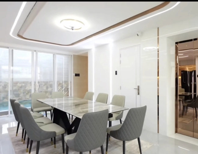 La parte exterior tiene una arquitectura moderna con colores blancos predominantes formas claras puertas de vidrio grandes y un sistema de ascensor separado. La sala de estar tiene un techo alto y una luz natural inunda; el tercer piso es el espacio privado de la pareja: sala de cambio de ropa armarios de marca y zona de entretenimiento.