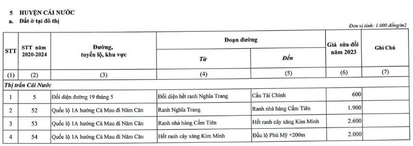 En la tabla de precios de la tierra de la provincia de Ca Mau (antigua) los precios de la tierra residencial en la zona de la ciudad de Ca Mau oscilan entre 690.000 y 30 millones de VND/m2. La zona con el precio mas bajo es la ruta del canal Thong Nhat (a la derecha de la ruta) - phuong Tan Xuyen desde el puente Thanh Nien hasta Mau Than. Mientras tanto la serie de calles Tran Hung Dao desde Phan Ngoc Hien hasta la calle 3/2 desde Bui Thi Truong hasta Phan Ngoc Hien y el tramo desde Ly Thuong Kiet hasta el