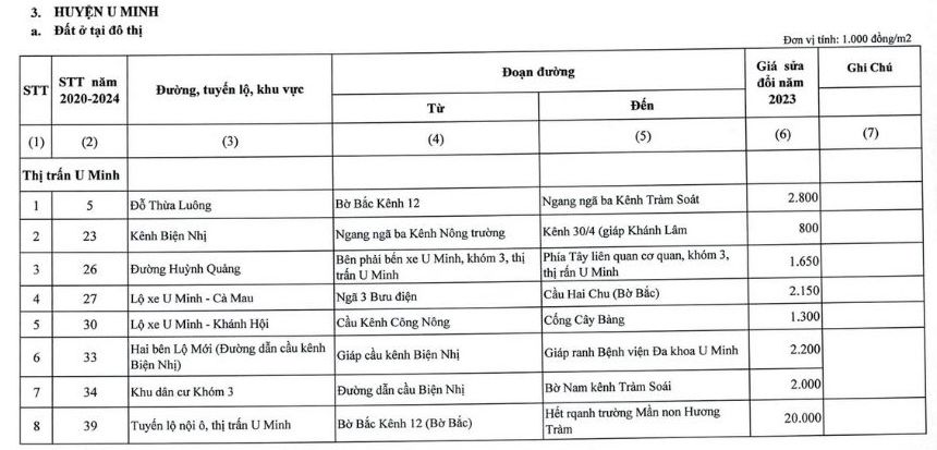 La comuna de Mu Minh ofrece a la venta terrenos residenciales en el area central desde 800.000 - 20 millones de VND/m2. El canal Bien Nhi desde la interseccion de la interseccion de Kenh Nong truong hasta el canal 30/4 (distrito de Khanh Lam) tiene el precio mas bajo de 800.000 VND/m2. La carretera interior de la ciudad de U Minh Bo Bac Canal 12 (Bo Bac) hasta el final de la guarderia Huong Tram esta listado con un precio de 20 millones de VND/m2.