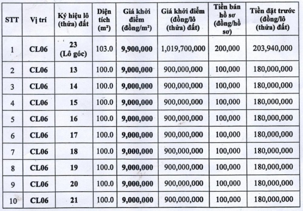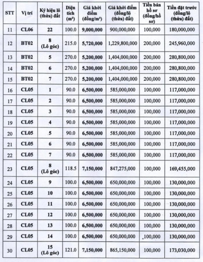 La superficie total de la subasta es de 4.225 m2 de los cuales cada lote tiene una superficie de 82.5 a 270 m2. El precio inicial oscila entre 5 2 y 9 millones de VND/m2 equivalente a mas de 536 millones de VND hasta mas de 1.4 mil millones de VND por lote.