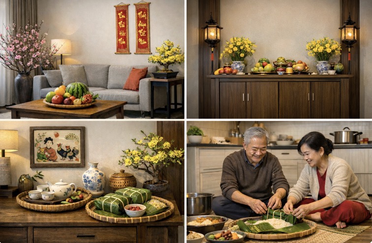 En un espacio de vida moderno, muchas familias aún conservan la tradición al decorar sus casas para el Tet, creando armonía entre comodidades y identidad cultural.