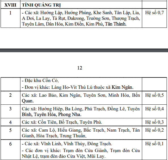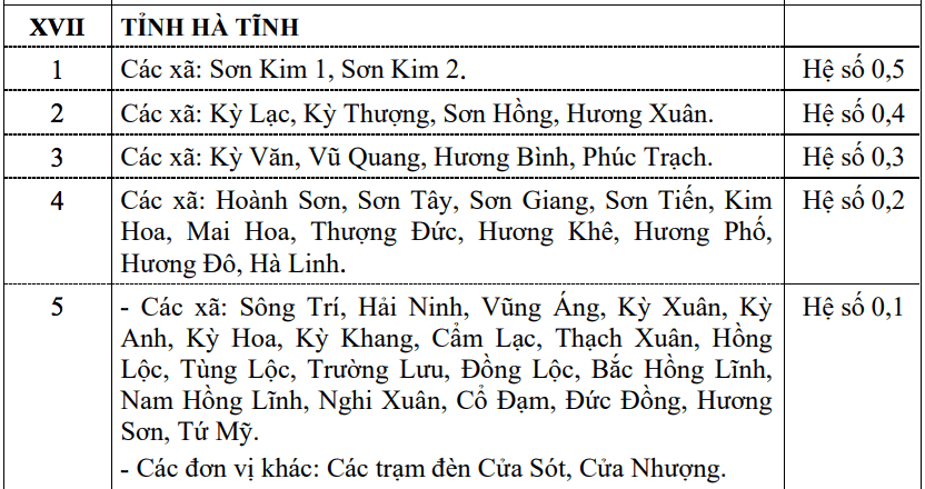 Basado en el Apéndice de la Lista de áreas que aplican subsidios regionales emitido junto con la Circular 23/2025/TT-BNV que regula el nivel de subsidios regionales para las provincias de Ha Tinh y Quang Tri en 2026 de la siguiente manera: