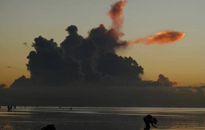 Dawn, la luz solar temprana de la mañana impresa en el agua, haciendo que la escena sea mas ancha, dificil de encontrar el horizonte. La superficie del mar era como un enorme espejo, reflejando el color rojo del cielo.