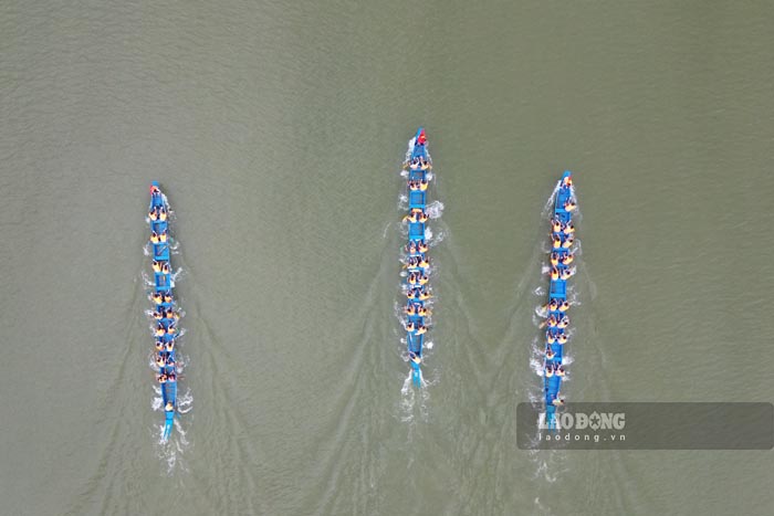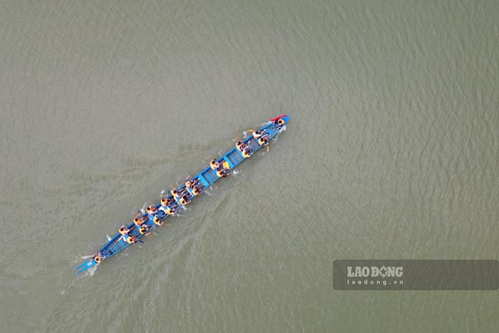 En el corazon del lago Song Da cuando sono el tambor de ordenes los cheo extendieron simultaneamente el techo. Cada barco de duoi En tradicional se movio con fuerza rompiendo la superficie del agua en medio de los vitores y animaciones que resonaban por todo el embarcadero como si añadieran fuerza a los atletas.