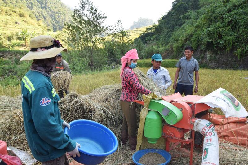 El Sr. Tong Van Anh residente de la aldea de It dijo con entusiasmo: 'Gracias a las maquinas de cosecha portatiles las cosechas son mucho menos laboriosas. Mi casa tiene casi 1 hectarea de arroz en terrazas esta cosecha cosecha alrededor de 100 paquetes de arroz casi 5 toneladas mas productivo que el año pasado'.