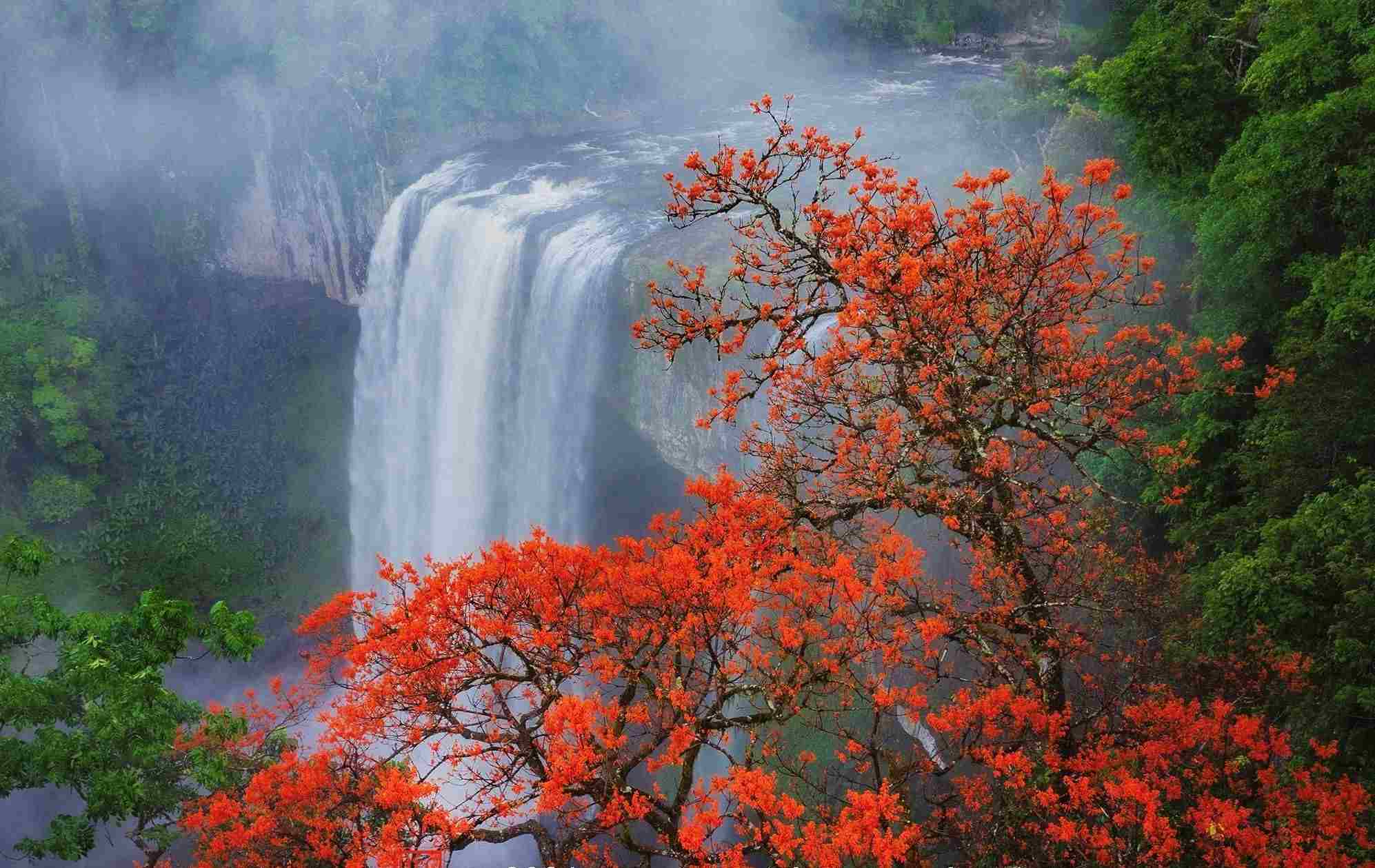 GIA Lai - Cascada K50 (o Hang en Waterfall) es como un hada escondida entre el bosque Kon Chu Rang en la brillante temporada de flores de maiz rojo.