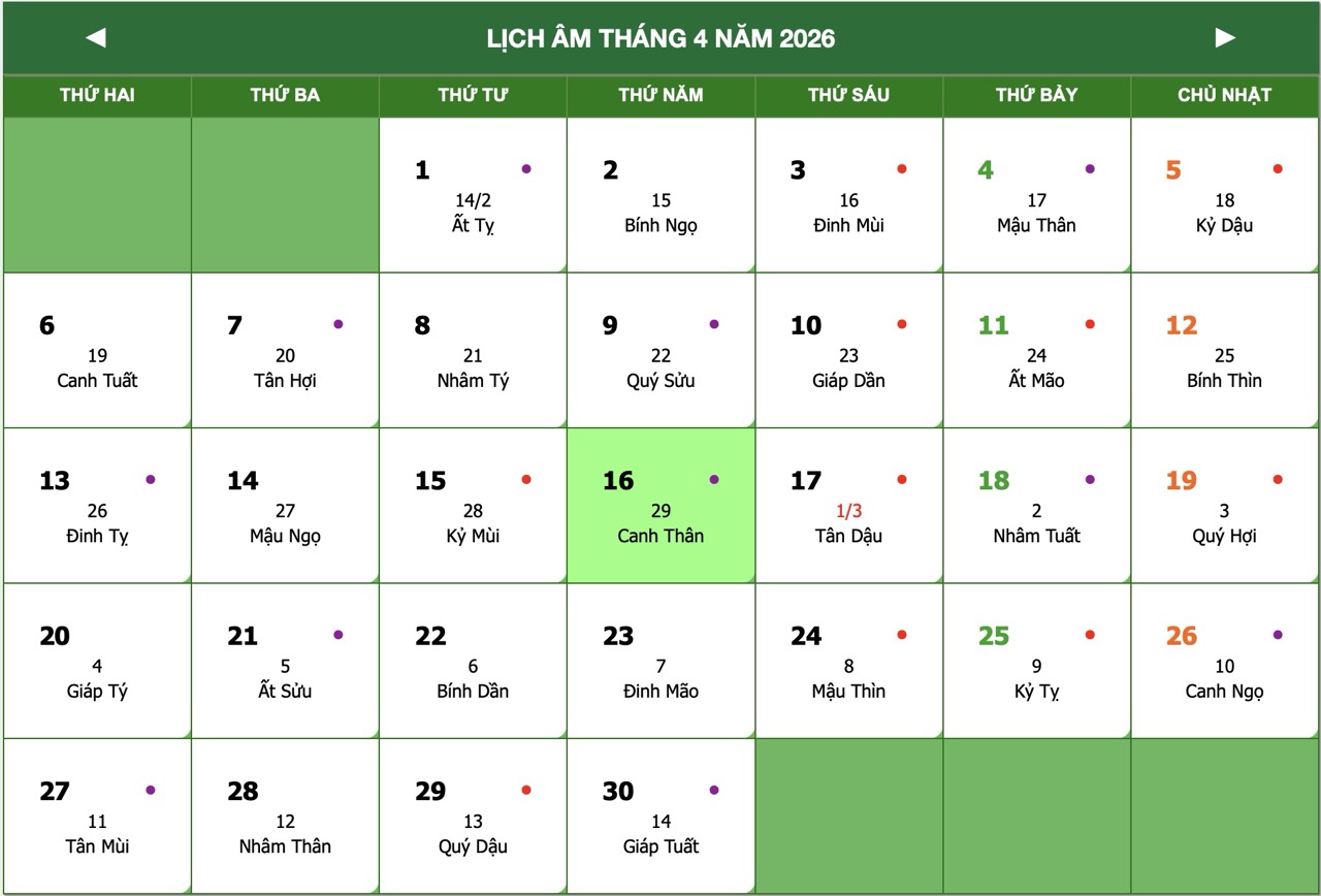 El calendario gregoriano de hoy es el 16 de abril de 2026 (jueves). El calendario lunar de hoy es el 29 de febrero del año Bính Ngọ (es decir, el día Canh Thân del mes Tân Mão del año Bính Ngọ), según el libro Lịch Vạn niên (Editorial Hồng Đức).