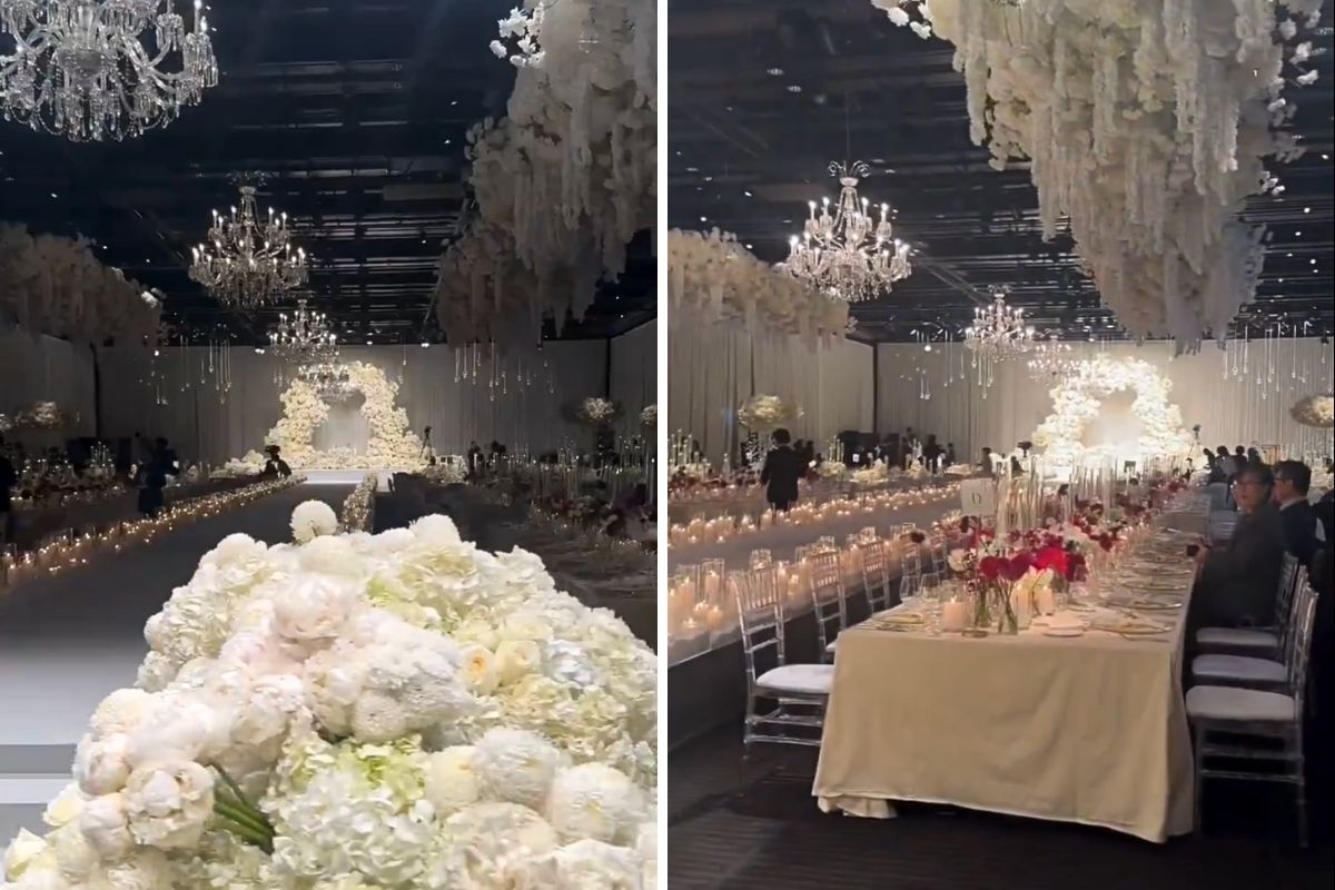 A traves de algunas imagenes y videos revelados por los invitados el espacio de la fiesta de bodas esta decorado en tonos blancos y lleno de flores frescas y romanticas.