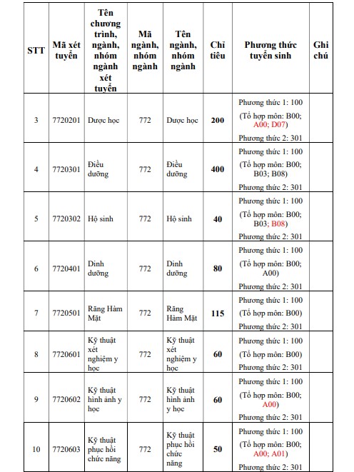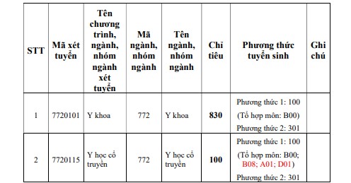 Las combinaciones de admisión incluyen: A00 (Matemáticas, Física, Química), B00 (Matemáticas, Química, Biología), B08 (Matemáticas, Biología, Inglés), D01 (Matemáticas, Literatura, Inglés), D07 (Matemáticas, Química, Inglés).