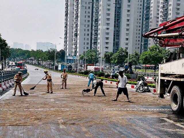 Hanoi - Los camiones de bombeo de concreto que circulan sobre el puente que cruza el ferrocarril de North Hoang, causan manchas de aceite que se cierran en el puente. El equipo de funcionamiento rapidamente se presento.