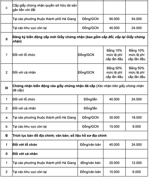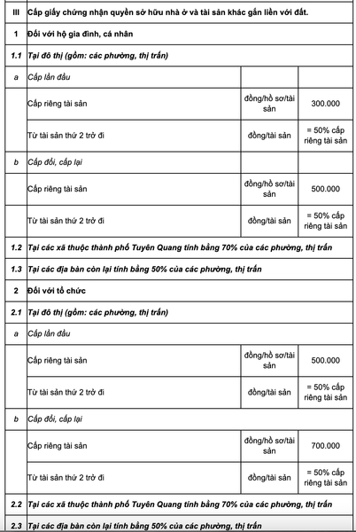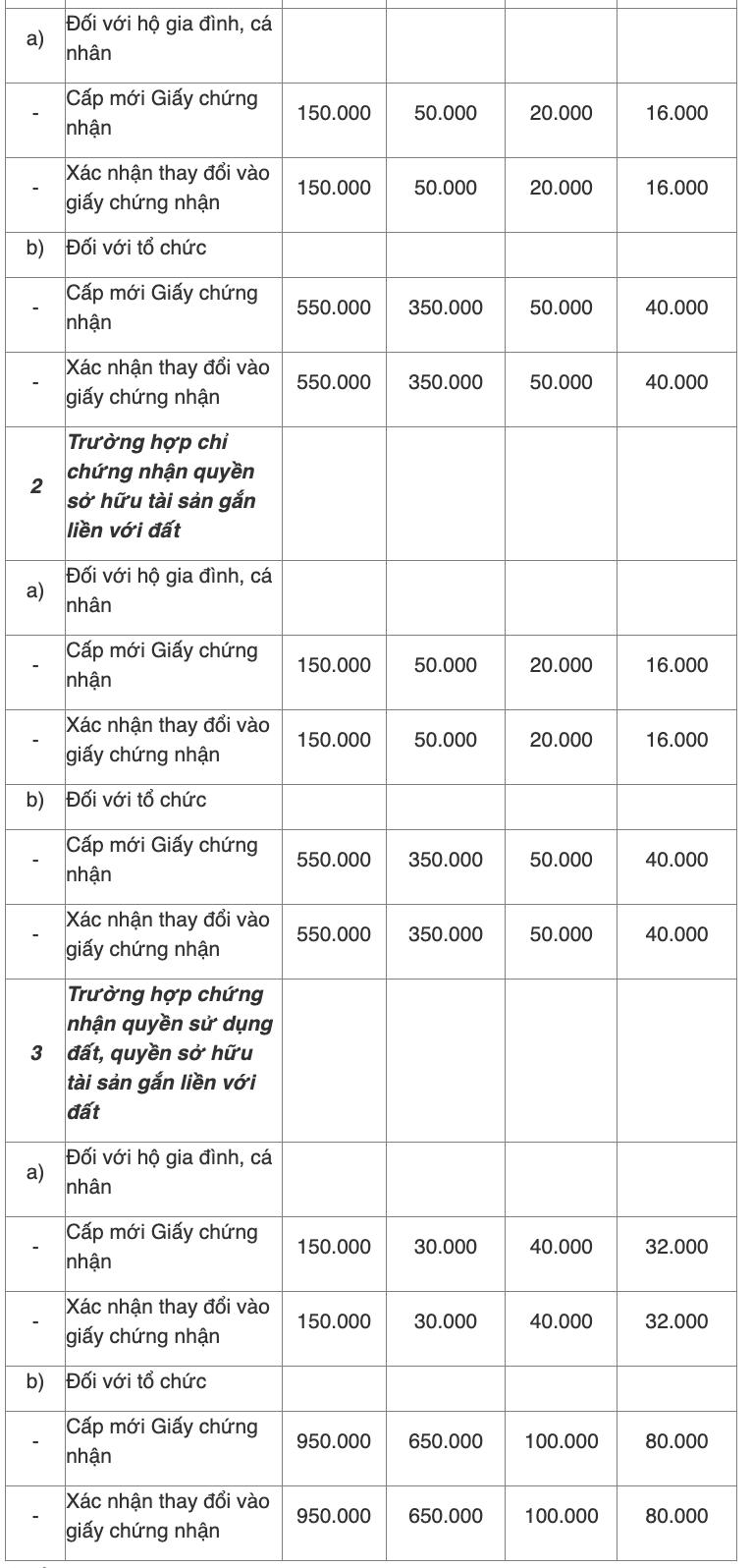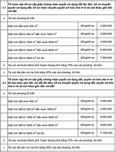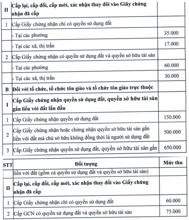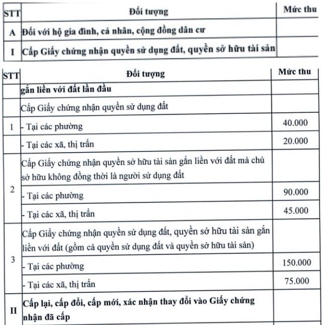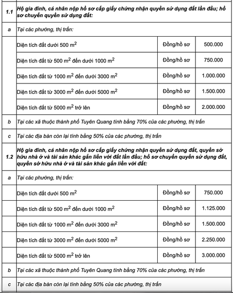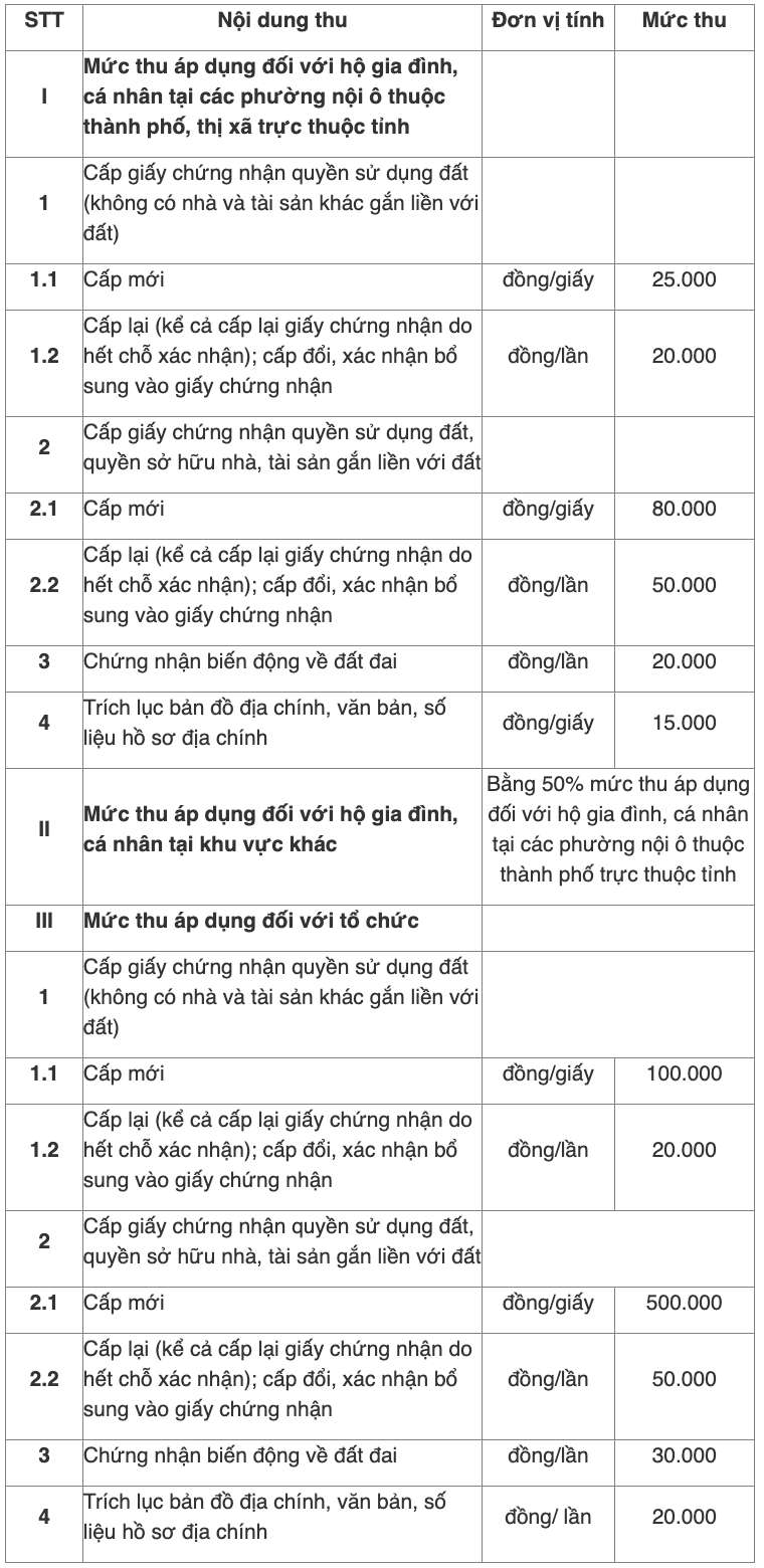 De acuerdo con el Articulo 6 de la Regulacion emitida adjunta a la Resolucion 09/2025/NQ-HDND de la provincia de Thai Nguyen que regula el nivel de cobro de tasas por la emision de Certificados de Derechos de Uso de la Tierra y Derechos de Propiedad de Bienes Incluidos en la Tierra (Codigo Rojo) en la provincia de Thai Nguyen a partir del 30 de julio de 2025 de la siguiente manera: