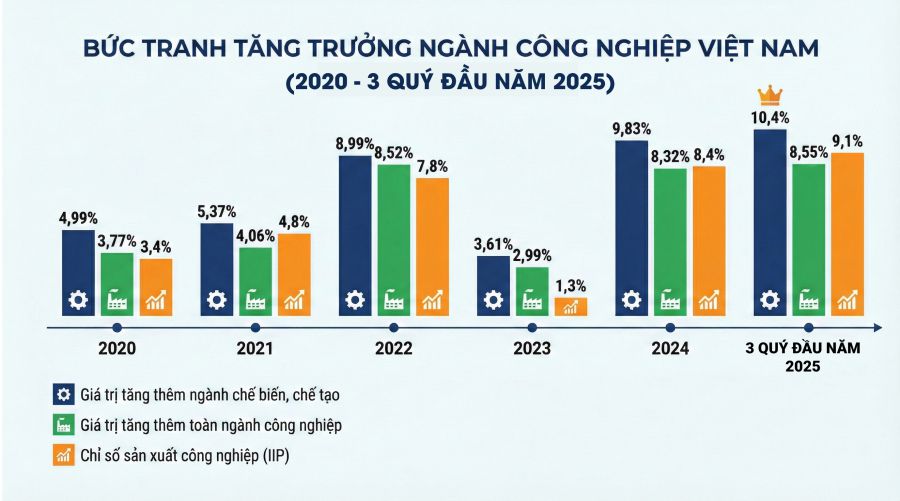 En la Conferencia de resumen del trabajo del sector de Industria y Comercio en 2025, periodo 2021 - 2025 y despliegue de tareas clave en 2026, la Viceministra de Industria y Comercio, Phan Thi Thang, dijo que en 2025 el indice de produccion industrial (IIP) se estima en un 9,5% (en 2024 aumento un 8,2%), el mayor aumento desde que ocurrio la pandemia de COVID-19. Entre ellos, el sector de procesamiento y manufactura se estima en un 10,6% (en 2024 aumento un 9,5%), contribuyendo con 8,5 puntos porcentuales al aumento general creando un gran impulso para impulsar el crecimiento macroeconomico.