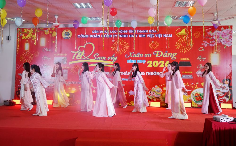 En la tarde del 5 de febrero, el Sindicato de la empresa de responsabilidad limitada Giay Kim Viet Nam (comuna de Nong Cong, provincia de Thanh Hoa) organizó solemnemente el programa "Tet Sum vay - Primavera de gratitud al Partido" 2026 para los miembros del sindicato y los trabajadores.