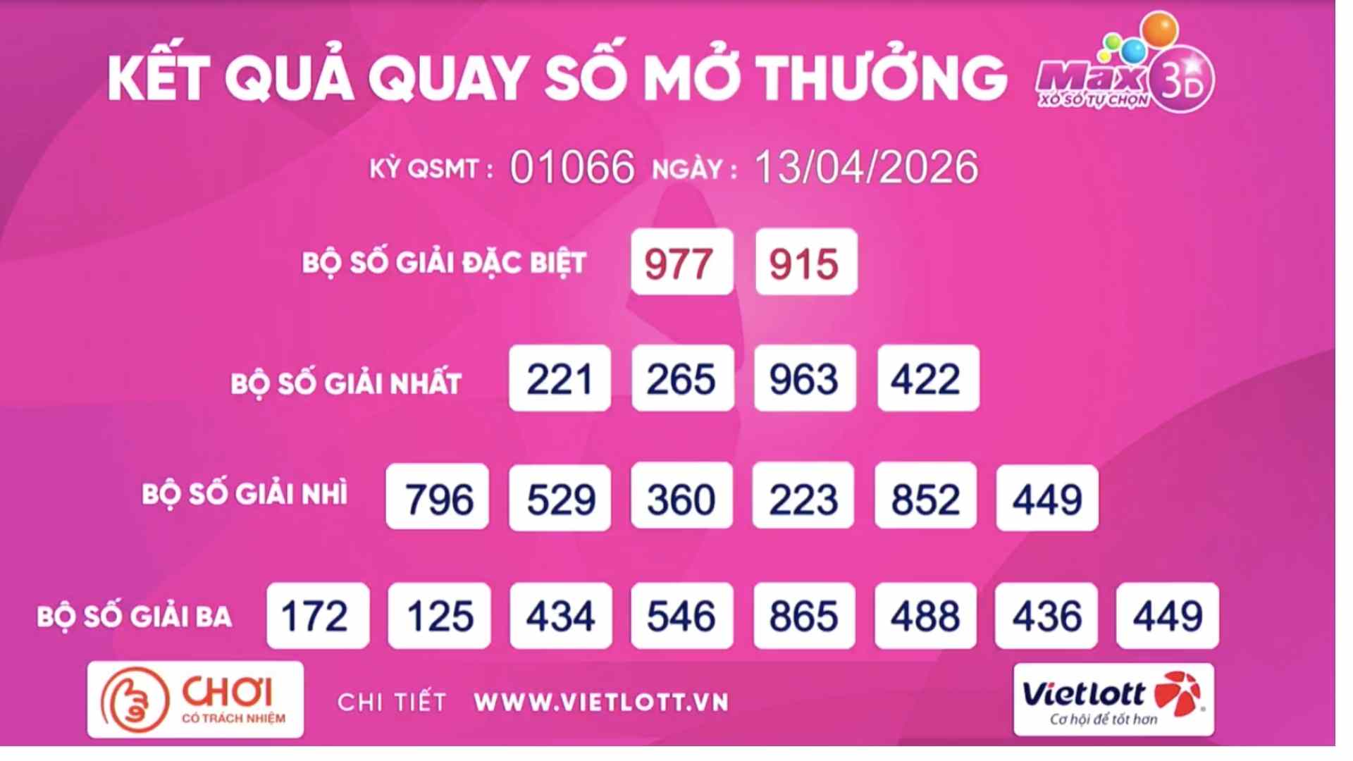 Los resultados de la Compañía de Lotería Electrónica de Vietnam (Vietlott) muestran que, en el sorteo número 01066 del tipo de lotería Max3D el 13 de abril de 2026, la secuencia de números de la suerte especial en el sorteo de hoy es: