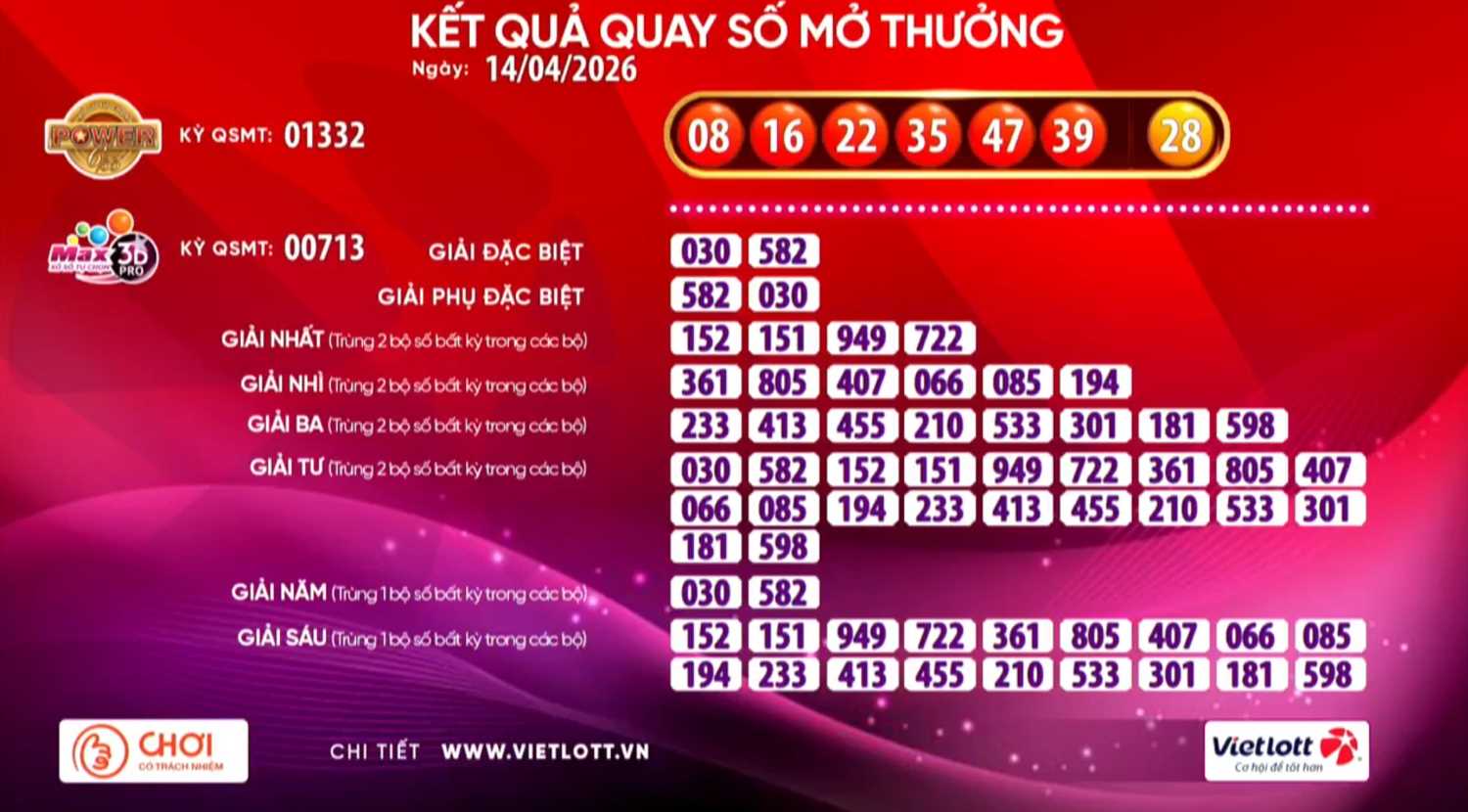 Los resultados de la Compañía de Lotería Electrónica de Vietnam (Vietlott) muestran que, en el sorteo número 01332 del tipo de lotería Power 6/55 del 14 de abril de 2026, la secuencia de números de la suerte especial en el sorteo de hoy es: