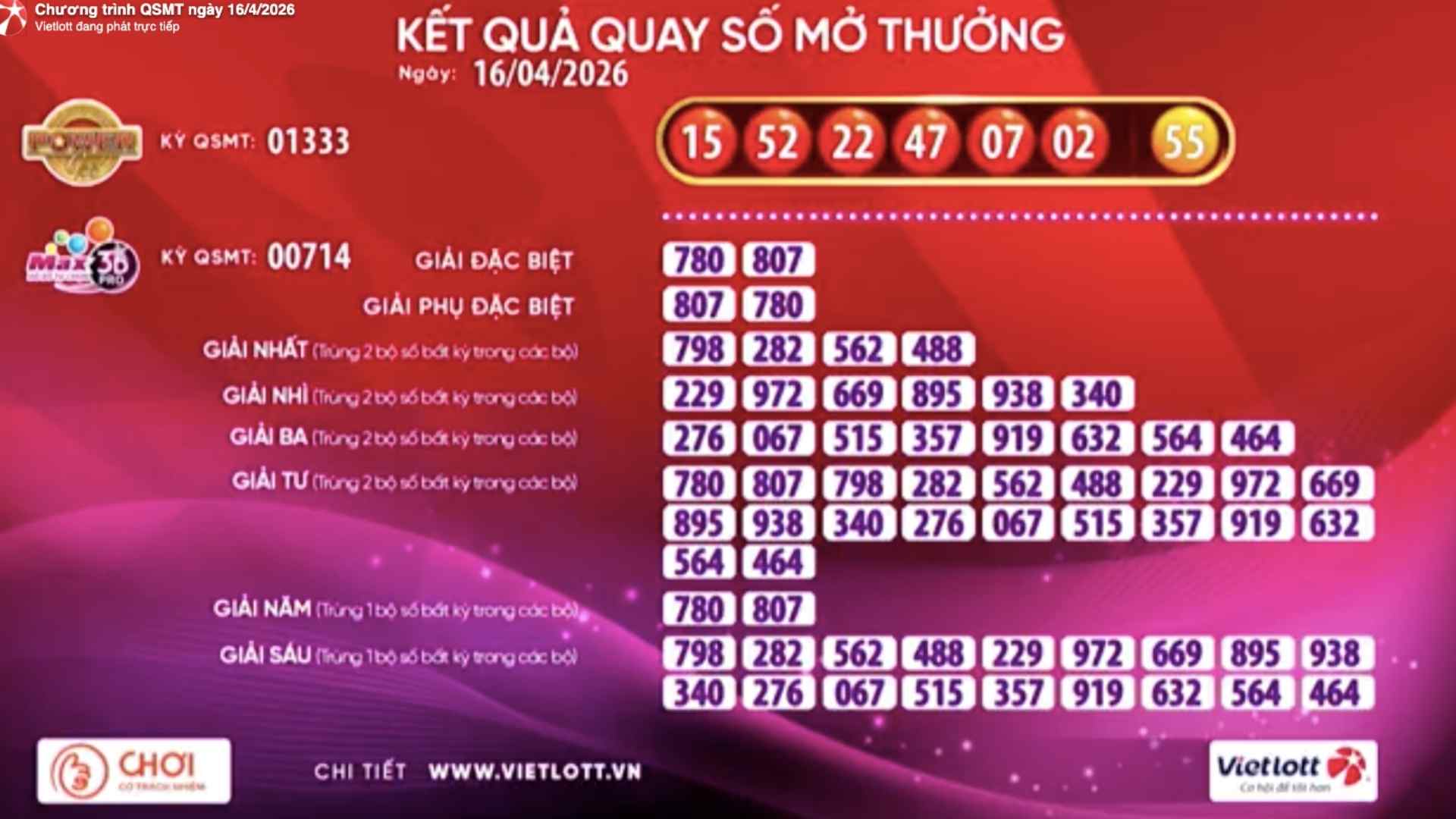 Los resultados de la Compañía de Lotería Electrónica de Vietnam (Vietlott) muestran que, en el sorteo número 01333 del tipo de lotería Power 6/55 del 16 de abril de 2026, la secuencia de números de la suerte especial en el sorteo de hoy es:
