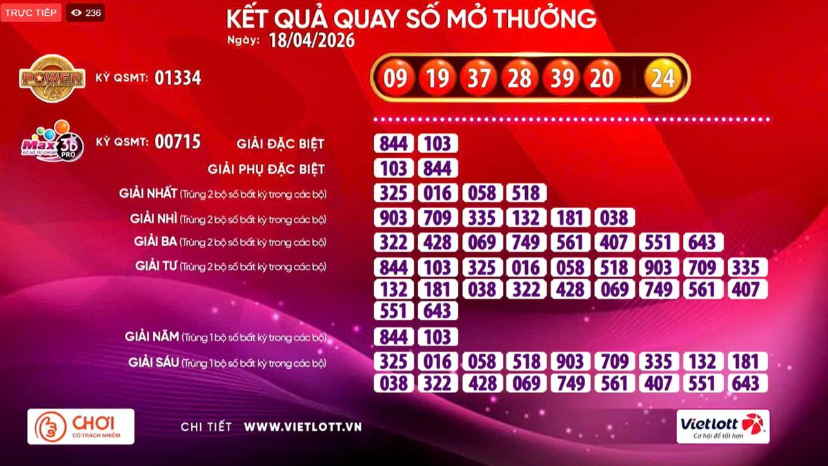 Los resultados de la Compañía de Lotería Electrónica de Vietnam (Vietlott) muestran que, en el sorteo número 01334 del tipo de lotería Power 6/55 del 18 de abril de 2026, la secuencia de números de la suerte especial en el sorteo número 01334 del producto de lotería Power 6/55 hoy es:
