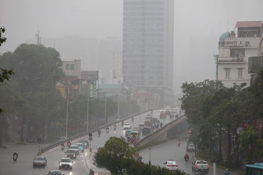 En la mañana del 23 de mayo, en Hanoi, la fuerte lluvia se derramo, lo que dificulta la gente.