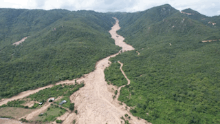 Primer plano de la colina destrozada por las inundaciones debido a la rotura del embalse en la montaña en Lam Dong