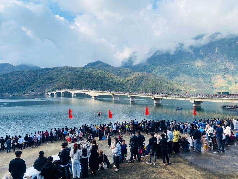 El 26 de febrero, en el muelle de carreras de botes del puente Pá Uôn, comuna de Quỳnh Nhai, el Festival Tradicional de Carreras de Botes 2026 se llevó a cabo animadamente, atrayendo a un gran número de personas y turistas.