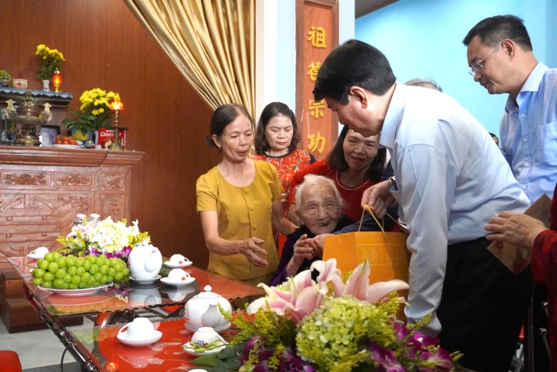 Al salir del monumento conmemorativo la delegacion visito a la Madre Heroina Vietnamita Nguyen Thi Ngon en la aldea de Bao An comuna de Go Noi. La Madre Ngon tiene 105 años este año tiene un esposo y una hija que se sacrificaron en la resistencia contra Estados Unidos. El Presidente del pais visito amablemente saludo animo y expreso su respeto por los grandes sacrificios que la familia de la Madre ha dedicado a la Patria.