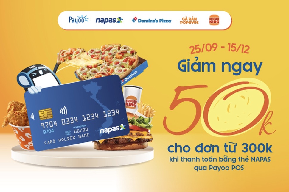 Del 25 de septiembre al 15 de diciembre de 2025 tres marcas famosas Domino Pizza Popeyes y Burger King acompañan a NAPAS para implementar promociones de descuento inmediato de 50.000 VND para facturas desde 300.000 VND.
