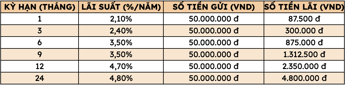 Por lo tanto depositando 50 millones de VND en Agribank los clientes pueden recibir la tasa de interes mas alta de la siguiente manera (aplicable a clientes individuales depositando directamente en el mostrador):
