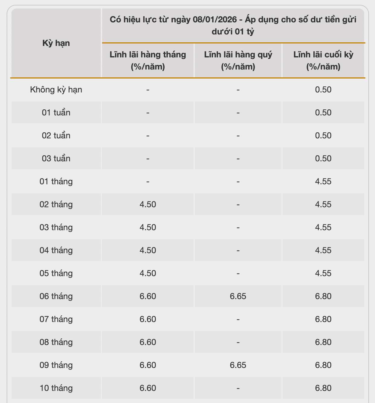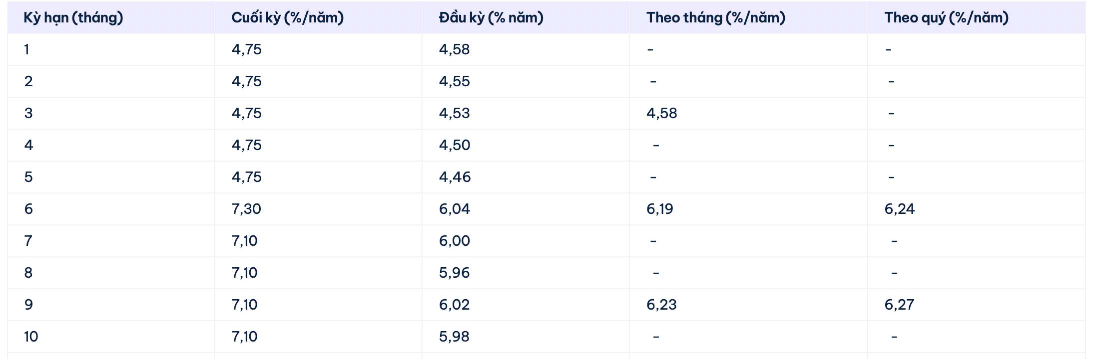 Cake by VPBank cotiza actualmente la tasa de interés más alta para un plazo de 13 meses al 7,1%/año cuando los clientes reciben intereses al final del plazo. Actualmente, la tasa de interés más alta listada por Cake by VPBank es del 7,3% aplicable a un plazo de 6 meses.