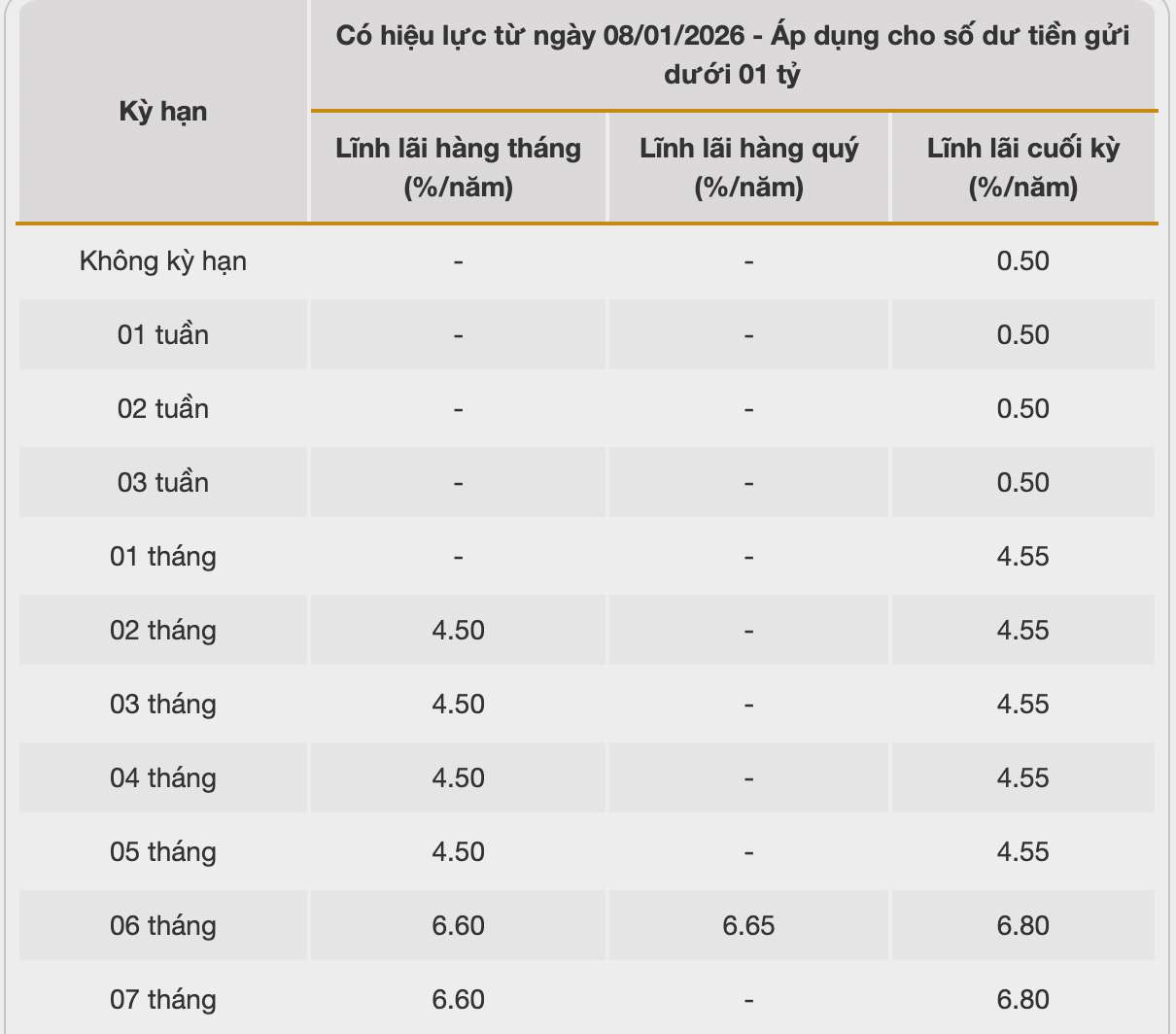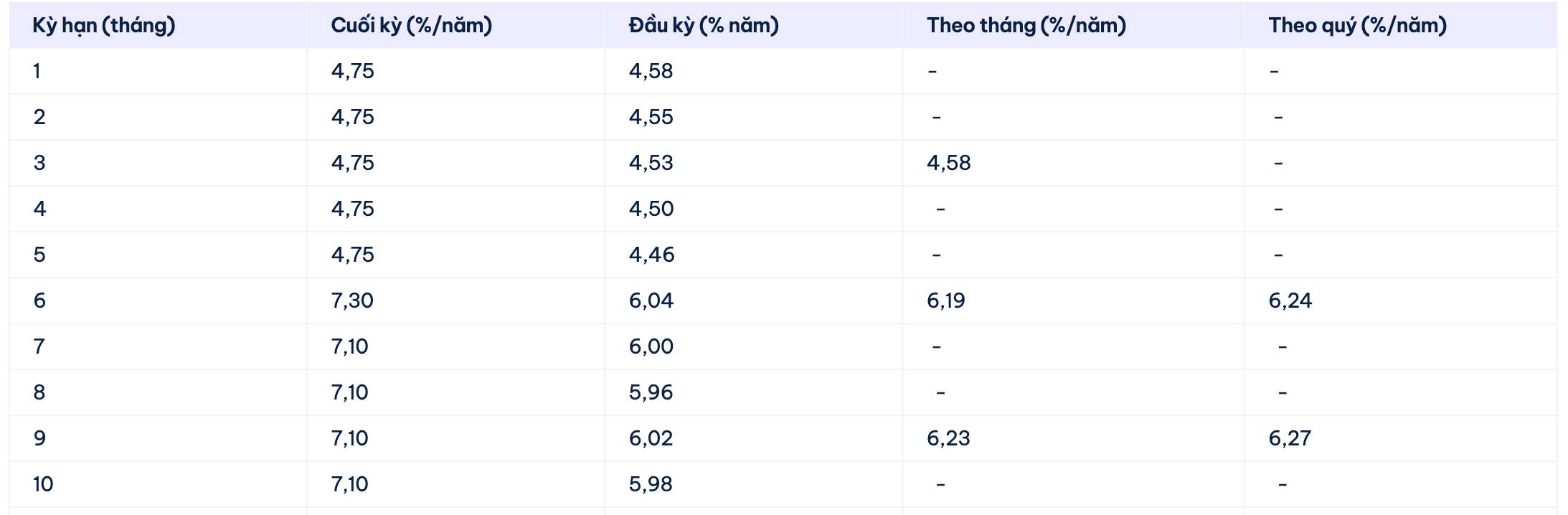 Segun una encuesta realizada a las 14:00 horas del 28 de enero de 2026 a casi 30 bancos, Cake by VPBank esta cotizando la tasa de interes mas alta a plazo de 6 meses en el 7,3%/año cuando los clientes reciben intereses al final del plazo. Cuando los clientes reciben intereses al principio del plazo, mensuales y trimestrales, recibiran tasas de interes del 6,04%, 6,19% y 6,24%/año respectivamente.