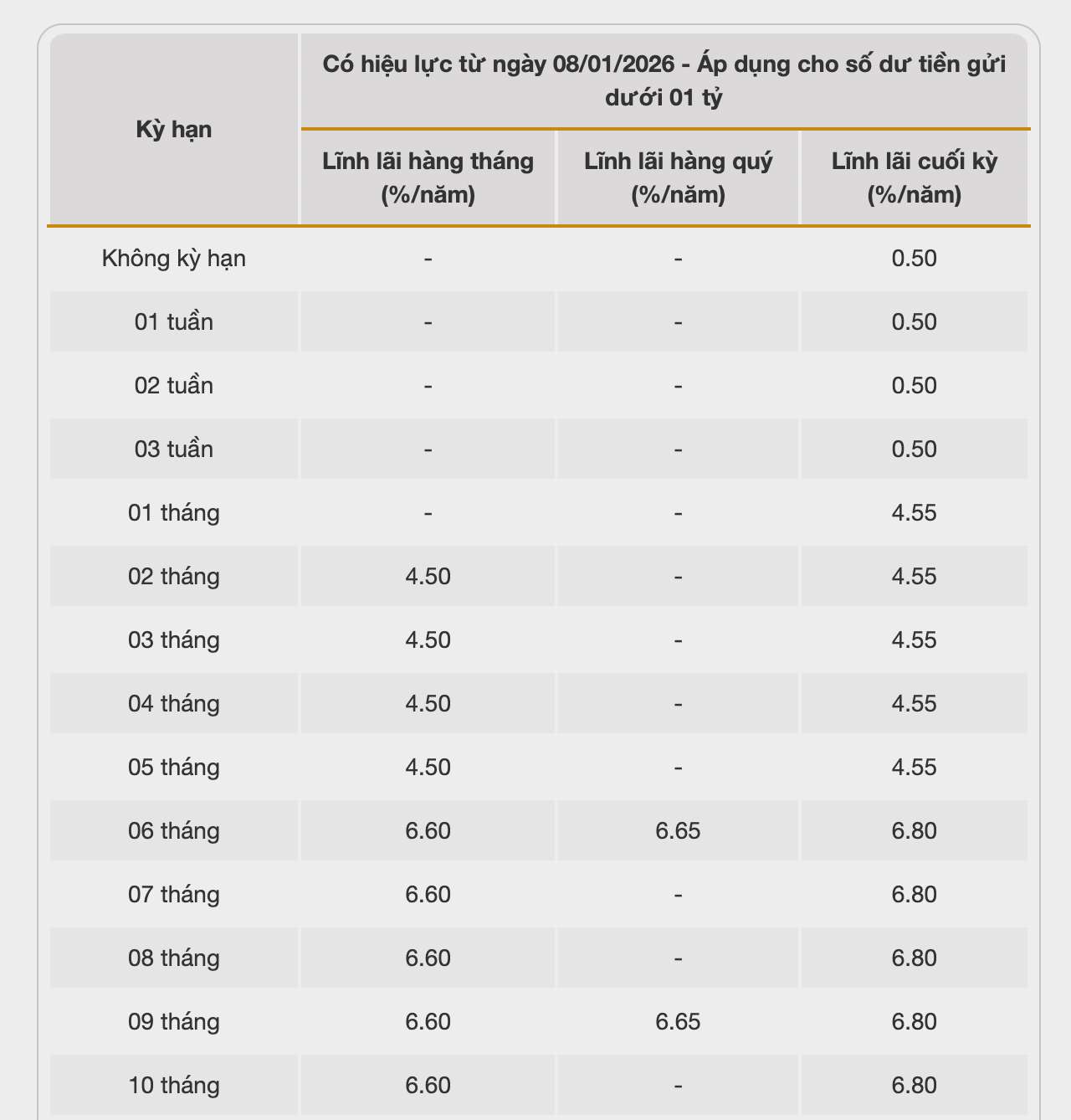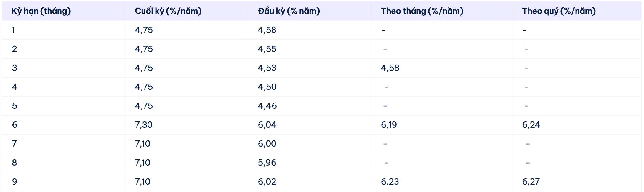 Vikki Bank cotiza actualmente la tasa de interés más alta para un plazo de 6 meses al 6,5%/año cuando los clientes depositan dinero en línea y reciben intereses al final del plazo. El plazo más alto que esta unidad cotiza actualmente es de 13 meses, al 6,7%.