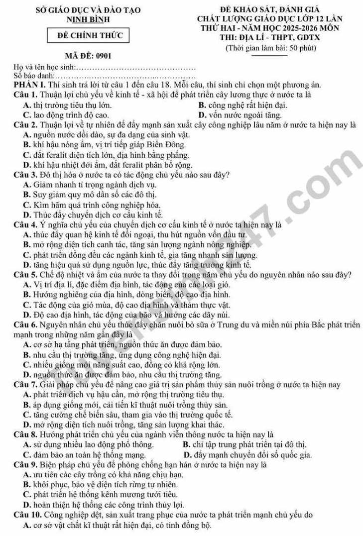 Examen y evaluación de la calidad de la educación de grado 12 por segunda vez en la asignatura de Geografía para el año escolar 2025 - 2026 (Departamento de Educación y Formación de Ninh Binh)