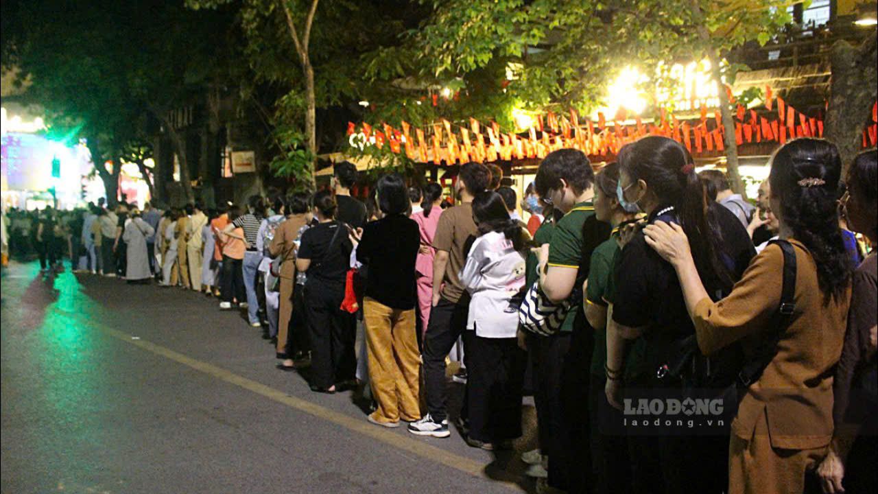 En medio de la noche, la gente llena de gente se alineaba en las calles alrededor de Quan Su Pagoda (distrito de Hoan Kiem, Hanoi) para esperar a que el turno adore al Buda.