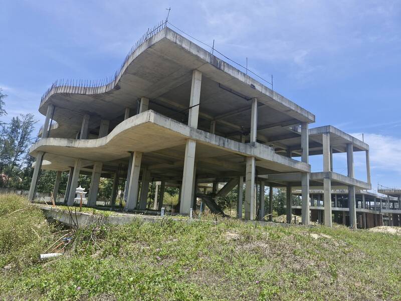 Las malas hierbas rodean las villas marinas inacabadas. Dos torres de apartamentos de 30 pisos solo se detienen en la obra bruta. Un lado es una playa azul suave, el otro lado es una obra irregular.