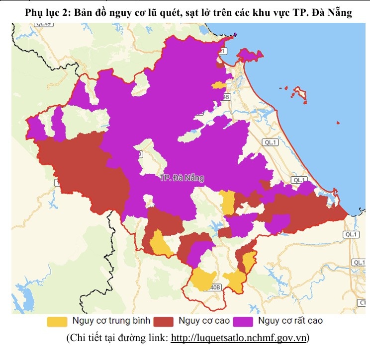 Las areas de advertencia de peligro incluyen 60 comunas y barrios que se extienden desde las llanuras hasta las zonas montañosas y montañosas especialmente las areas con terrenos de pendientes y taludes la carretera de paso del paso de Hai Van la ruta Hoang Sa – Truong Sa y la zona turistica de Ba Na – Suoi Mo. Las autoridades tambien recomiendan a la poblacion que no cruce los tuneles subterraneos y los paso de paso de montaña en las fuertes lluvias; evacuar proactivamente las zonas de la ladera de las montañas