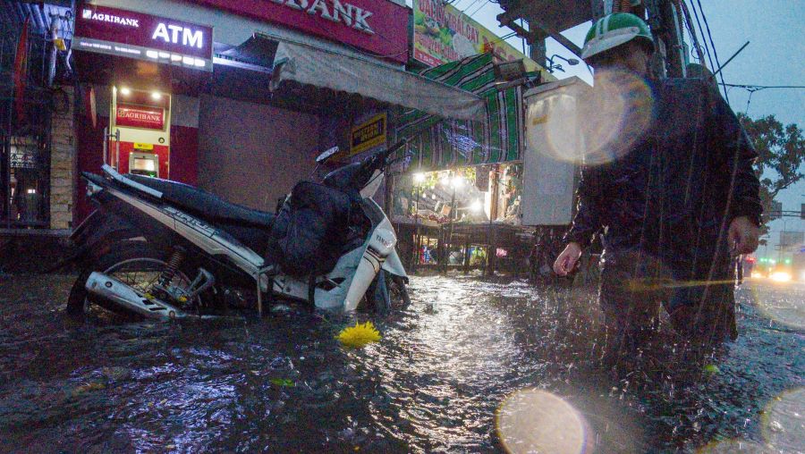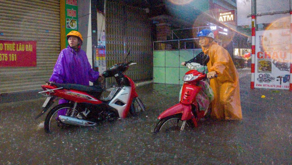En las rutas Au Co Ton Duc Thang Nam Tran... el agua subio hasta las rodillas muchos vehiculos quedaron sin motor en medio del agua.