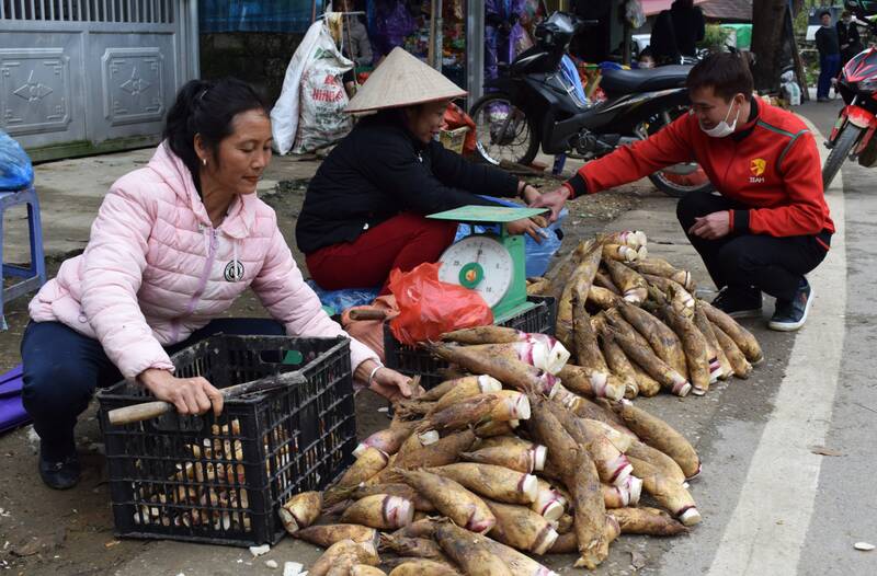 Desde temprano en la mañana, al cruzar el paso de Ban, muchas motocicletas estacionadas al borde de la carretera, los propietarios caminaron hacia el bosque para cavar brotes de bambú. Anteriormente, los árboles sặt y vầu crecían principalmente de forma natural, pero en los últimos años la gente ha traído plántulas para plantar en campos y bosques de producción para ser proactivos en los ingresos.
