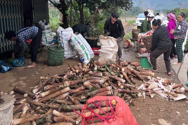 Al mismo tiempo, en las áreas de Đu Lau, Suối Lèo, Păn Ếch, Nghĩa Hưng, el ambiente de cosecha de brotes de bambú también es muy animado. Desde temprano en la mañana, la gente de las aldeas ha subido al bosque de bambú vầu para cavar brotes de bambú para venderlos a los puntos de compra.