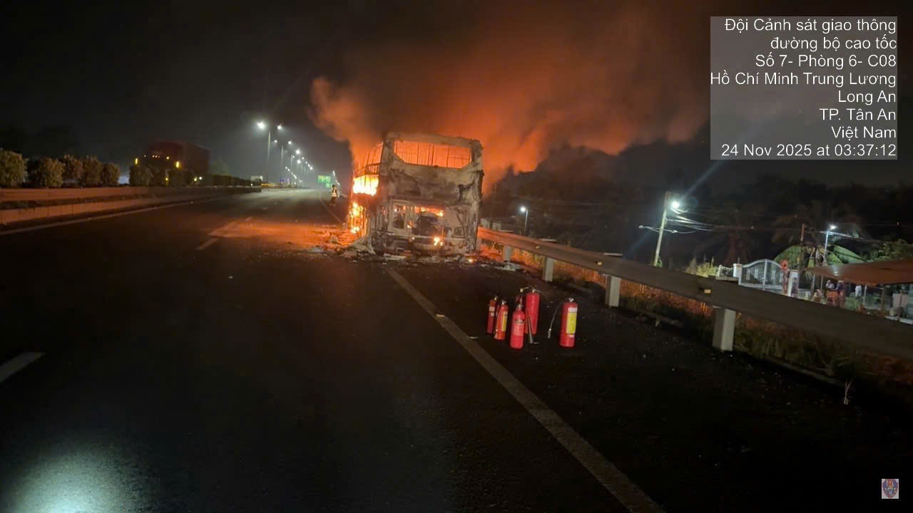 En la mañana del 24 de noviembre la Policia de Trafico y la Policia de Prevencion y Lucha contra Incendios - Rescate de la Policia Provincial de Tay Ninh coordinaron con la unidad de gestion de la autopista TPHCM - Trung Luong para investigar la causa del incendio del autobus de pasajeros que ocurrio en la madrugada del mismo dia.