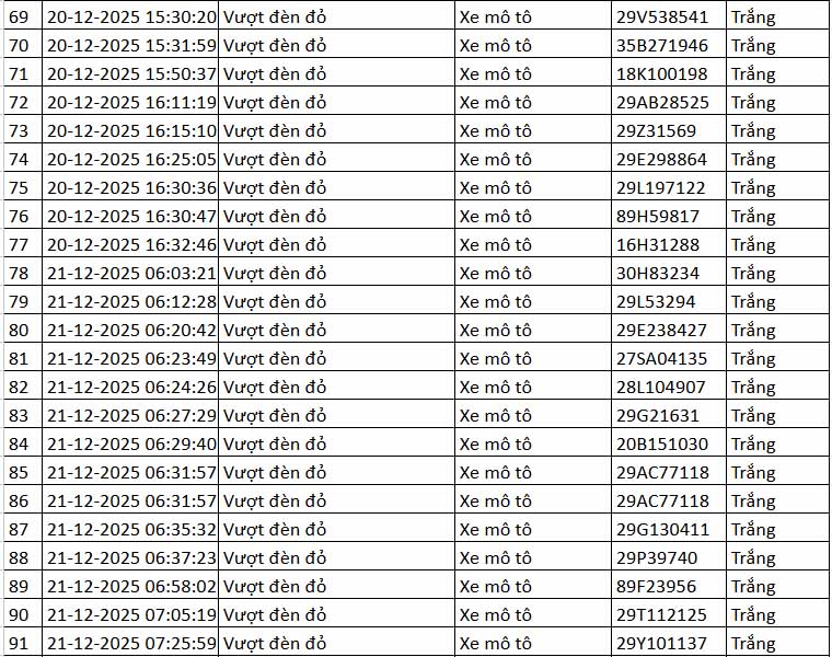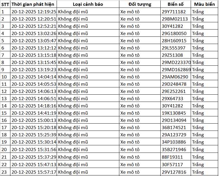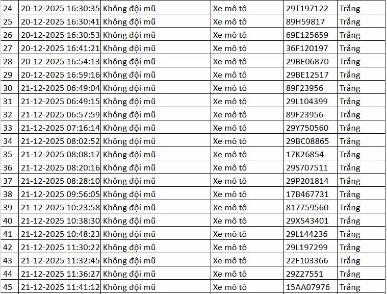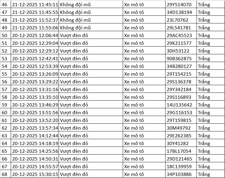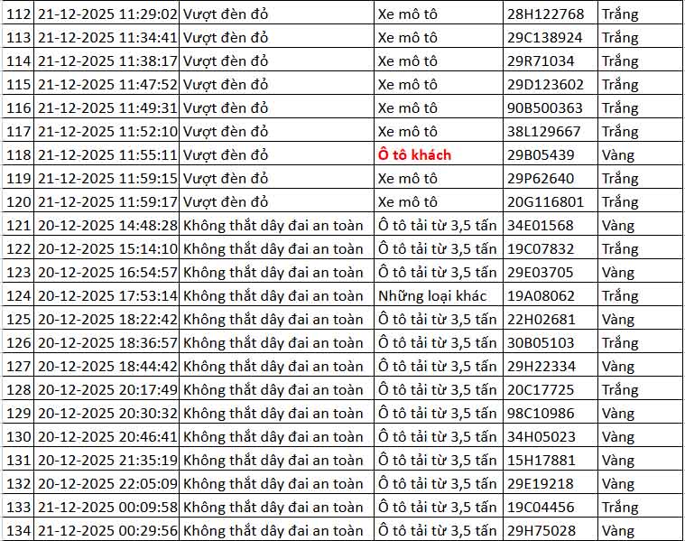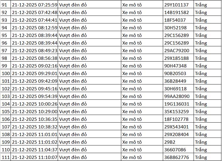 Informacion del Departamento de Policia de Trafico (CSGT) - Ministerio de Seguridad Publica en el periodo comprendido entre las 12:00 horas del 20 de diciembre de 2025 y las 12:00 horas del 21 de diciembre de 2025 el sistema de camaras que aplica inteligencia artificial (IA) operado por esta unidad registro una serie de infracciones de orden y seguridad vial en Hanoi y la autopista Noi Bai - Lao Cai.