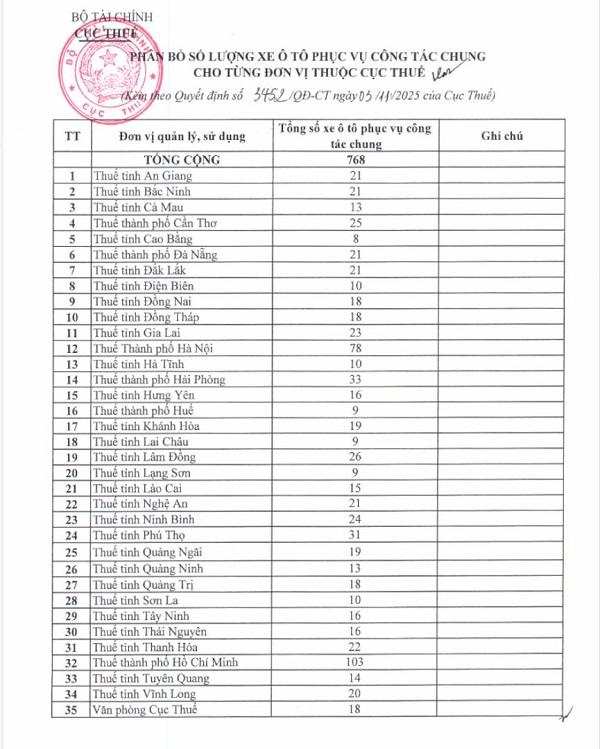 Segun la decision anterior el numero total de vehiculos asignados es de 768 vehiculos. La unidad asignada con mas vehiculos es Thue de la ciudad de Ho Chi Minh con 103 vehiculos.