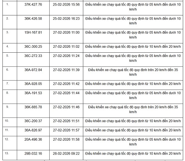 La policía de tráfico, la policía de la provincia de Thanh Hoa también anunció la lista de vehículos que violaron las normas de velocidad desde el 16 de febrero de 2026 hasta el 28 de febrero de 2026 en algunas carreteras nacionales. Entre ellos, solo en la Carretera Nacional 15 hay 13 casos como los siguientes: